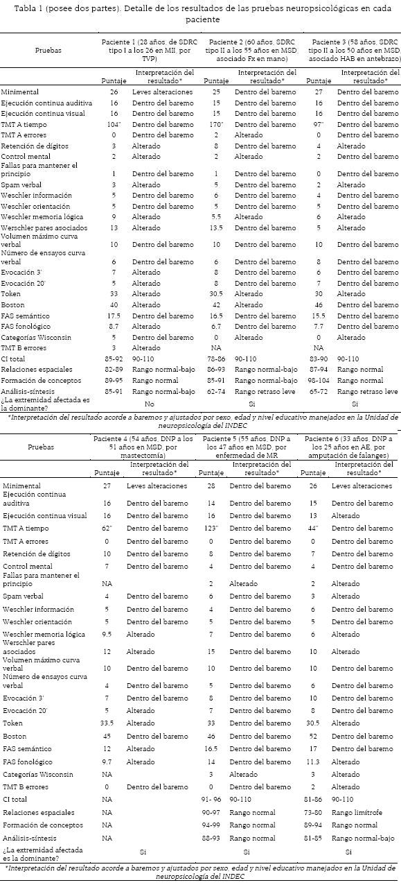 El promedio del estado mental en todos los pacientes, evaluado a través del Minimental test, es de 26,5 puntos (DE±1 punto. Valor mínimo 25 y valor máximo 28 puntos). El coeficiente intelectual (CI) de 4 pacientes (66.7%) se encuentra dentro del rango normal-bajo (80-90), y en un paciente (16.7%) dentro del rango normal (90-110). En la Tabla 1 (posee dos partes) se detallan las pruebas neuropsicológicas obtenidas en cada paciente.