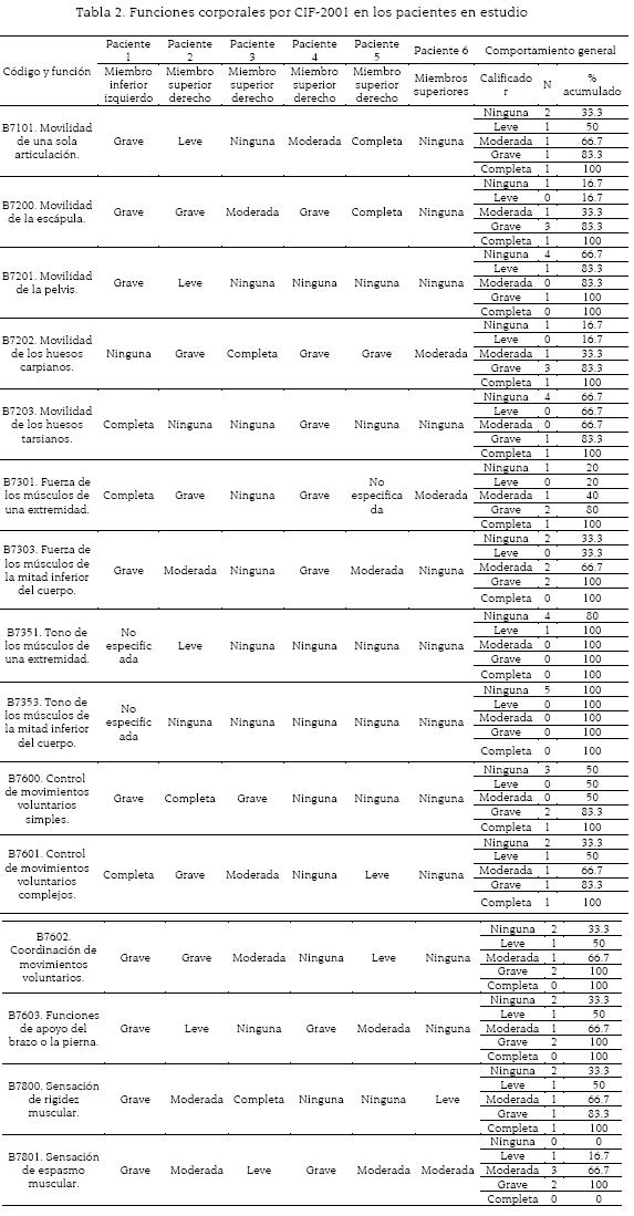 Funciones corporales: El 50% de los pacientes no presenta ninguna limitación en el control de movimientos voluntarios simples. Cuatro pacientes (66.7%) no presentan limitaciones para la movilidad de la pelvis ni de los huesos tarsianos. El 66.7% de los pacientes posee algún tipo de limitación (leve-completa) en la movilidad de una sola articulación, control de movimientos voluntarios complejos y sensación de rigidez muscular. Este mismo porcentaje presenta limitaciones entre leve y grave para la coordinación de movimientos voluntarios y funciones de apoyo del brazo o la pierna, y una limitación moderada-grave en la fuerza de los músculos de la mitad inferior del cuerpo. El 80% de los pacientes no presenta alteraciones en el tono de los músculos de una extremidad, pero presenta una limitación moderada-completa en la fuerza de éstos. Cinco pacientes (83.3%) presentan sensación de espasmo muscular entre moderado y grave, y una limitación moderada-completa en la movilidad de la escápula y de los huesos carpianos. El 100% no presenta limitaciones en el tono de los músculos de la mitad inferior del cuerpo.