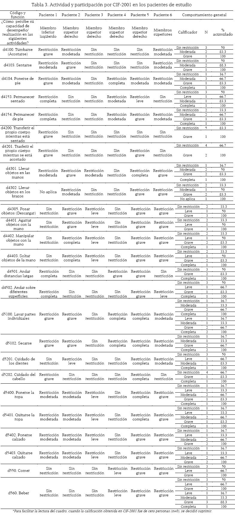 Actividades y participación: El 50% de los pacientes no presenta restricciones para el cuidado de los dientes, comer, beber, tumbarse (acostarse), sentarse, permanecer sentado, o andar distancias largas y sobre diferentes superficies. La mitad de los pacientes posee una restricción entre moderada y grave para llevar objetos en los brazos, y grave para agarrar y descargar objetos con la mano. Tres pacientes (66.7%) no presentan restricciones para transferir el propio cuerpo mientras está acostado ni para el cuidado de su cabello. El 66.7% tiene algún nivel de restricción (leve-completa) para manipular y soltar objetos con la mano, y una restricción moderada-completa para sostenerse de píe. Cinco pacientes (83.3%) no presentan restricción para transferir el cuerpo mientras están sentados. El 83.3% presenta una restricción entre moderada y completa para ponerse de píe, llevar objetos en la mano, lavar partes individuales de su cuerpo y secarse, y restricción leve-grave para ponerse y quitarse el calzado. Este mismo porcentaje presenta algún tipo de restricción (leve-completa) para ponerse y quitarse la ropa. El 100% de los pacientes posee algún tipo de restricción (leve-completa) para lavar todo su cuerpo y realizar manualidades.