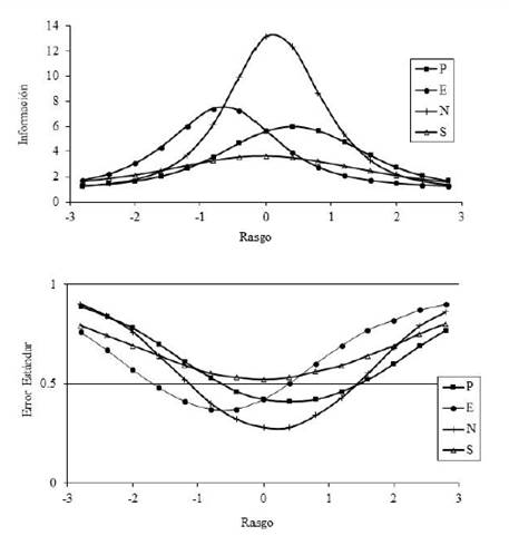 En los gráficos de la Figura 1 se pueden comparar las funciones de información y error estándar de estimación correspondientes a cada uno de los factores evaluados con el EPQ-RS. La escala N sobresale por aportar la mayor información predominantemente entre los valores medios del rasgo que mide. Las escalas P y E brindan información considerablemente más baja para la medición de sus respectivos constructos. La máxima precisión de P se alcanza para evaluar a sujetos con valores medio-bajos de Psicoticismo. En cambio, la escala E resulta más precisa cuando los evaluados se localizan en niveles medio-altos de Extraversión. Por último, la escala S mostró una función de información relativamente plana en todo el recorrido del rasgo latente.