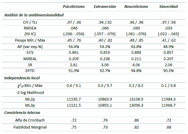 Los coeficientes de confiabilidad globales obtenidos desde la teoría clásica (Alfa de Cronbach) y la TRI (Fiabilidad Marginal) fueron aceptables para todas las escalas (Tabla 1). Aun así, resulta evidente que Sinceridad presentó coeficientes más bajos que el resto de los factores.