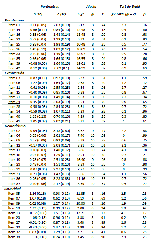Las diferencias de los -2LL obtenidas en el ajuste del modelo más restringido (ML2p) y el modelo más general (ML3p) no registraron significación estadística para las dimensiones evaluadas en el EPQ-RS: Psicoticismo (χ 2 = 14.2, gl = 10, p =.29), Extraversión (χ 2 = 8.85, gl = 10, p =.55), Neuroticismo (χ 2 = 12.6, gl = 12, p =.40), Sinceridad (χ 2 = 15.6, gl = 10, p =.11). Estos resultados indican que la estimación adicional del parámetro c del ML3p no mejora sustantivamente el ajuste de los datos al modelo y, en consecuencia, la parsimonia justifica la preferencia por la elección del ML2p.