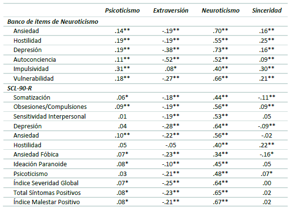 En la Tabla 3 se exhiben las correlaciones bivariadas obtenidas al estudiar las asociaciones de los factores del modelo PEN con las escalas de SCL-90-R y las facetas de Neuroticismo del BIN. La intensidad y dirección de las correlaciones son acordes a lo esperable desde una perspectiva teórica para aportar evidencias de validez convergente y discriminante. La asociación más fuerte de la escala P fue con la faceta Impulsividad (BIN) y no se registraron correlaciones significativas con las dimensiones de SCL-90-R. Finalmente, la escala S presentó correlaciones relativamente bajas con todos los constructos usados como criterio externo. Se destacan algunas asociaciones con Impulsividad (BIN) y Hostilidad (BIN y SCL-90-R), que podrían vincularse con contenidos de los ítems de S en los que debe reconocerse la transgresión de normas sociales.