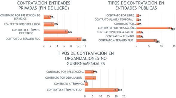 Se evidenció la flexibilización de los contratos de trabajo en las instituciones del sector público, privado y del tercer sector. En las entidades públicas el contrato por prestación de servicios representa un 48%; en las privadas el contrato a término fijo está representado en un 48% y en las ONG (del tercer sector) 58%, ambos tipos de contratación, representan pérdidas en la garantía de los derechos laborales de los profesionales (figura 2).