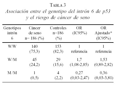 En cuanto a los polimorfismos de los intrones 3 y 6 del gen p53 se ha mostrado en diferentes estudios que son los genotipos W/M y M/M los asociados con el riesgo de desarrollo de cáncer mamario. (Dunning y cols., 1999; Khaliq y cols., 2000; Sjalander y cols., 1996). Para el intrón 3, en el estudio de Wan-Gohrke y cols., se observó una asociación positiva y significativa estadísticamente para el genotipo W/M del intrón 3 (OR= 1,3 IC95% 1,0-1,7), pero no para el intrón 6 (OR ajustado por el número de embarazos, 1,2 IC95% 0,9-1,6) (Wang-Gohrke y cols., 2002). En el presente estudio los resultados muestran una asociación significativa con el genotipo W/M tanto del intrón 3 (OR= 18,24 IC95% [2,30-144,4]) como del intrón 6 (OR=1,56 IC 95% [0,89-2,82]), indicando que existe un riesgo cinco veces mayor para desarrollar cáncer de seno heredofamiliar si se tiene el genotipo W/M para el intrón 6 y de 18 mayor cuando se tiene este genotipo para el intrón 3. Para este último genotipo es conveniente en estudios posteriores hacer los ajustes pertinentes para tener una población que esté en equilibrio de Hardy-Weinberg para establecer con mayor confiabilidad el riesgo relativo. El genotipo M/M no mostró asociación con cáncer para ninguno de los dos intrones, contrariamente a lo indicado en la literatura (Barbone y cols., 1996; Dunning y cols., 1999; Sjalander y cols., 1996; Suspitsin y cols., 2003).