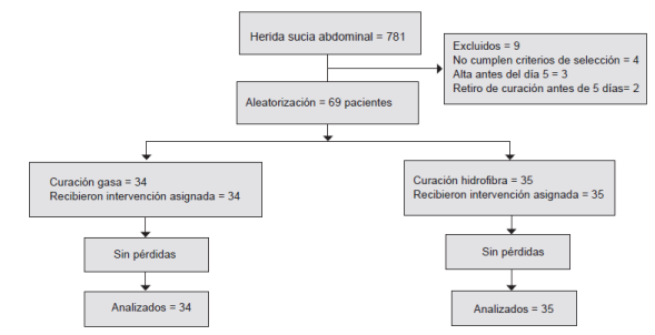 De 78 pacientes elegibles, se incluyeron 69 para el análisis final; a 34 se les hizo curación con gasa y, a 35, curación con apósito de hidrofibra y plata. En los nueve pacientes excluidos, no fue posible hacer el seguimiento de los resultados y, tampoco, la intervención propuesta (figura 1).