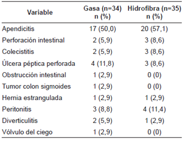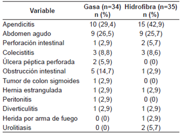 Hubo predominio del puntaje 3, en la clasificación de la American Society of Anesthesiologists (ASA). Todos los pacientes recibieron profilaxis antibiótica según el protocolo institucional, y la laparotomía fue el abordaje más utilizado (tabla 1). En las tablas 2 y 3 se muestran los diagnósticos de ingreso y posoperatorios de ambos grupos analizados, los cuales fueron similares en proporción para cada grupo, prevaleciendo el diagnóstico de apendicitis.