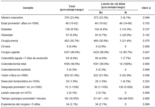 La incidencia de lesión de las vías biliares fue de 0,87 % (14 pacientes). Los factores de riesgo asociados con una colecistectomía difícil, y que pudieran tener alguna relación con la lesión de las vías biliares, como diabetes mellitus, cirugía previa, cirrosis o edad mayor a 65 años 5, fueron todos estudiados, pero no se encontró ninguna relación con la presentación de lesión de las vías biliares. Tampoco se encontró asociación con el tiempo de colelitiasis (p=0,18) ni la presencia de inflamación aguda (p=0,428) (tabla 2).