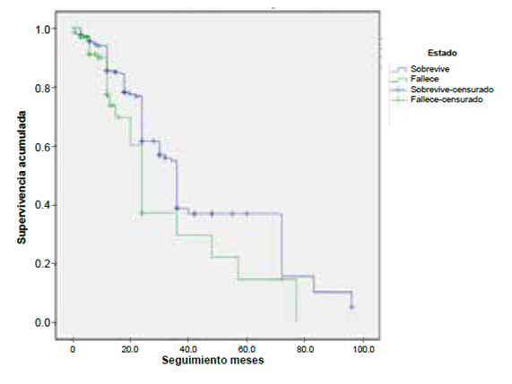 No se encontró una relación estadísticamente significativa entre las complicaciones quirúrgicas y los fallecimientos (p=0,37). Se elaboró una curva de supervivencia con el método de Kaplan-Meiery se obtuvo un log rank de 0,010 (figura 5).