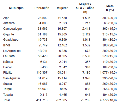 Tabla 1. Habitantes del departamento del Huila por municipios, número de mujeres, número de mujeres entre 50 y 70 años y meta de cobertura del plan de tamización del Huila, agosto de 2012 a diciembre de 2013.