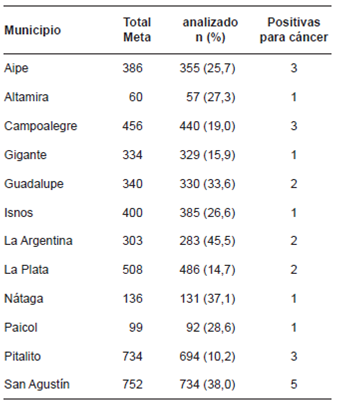 Las metas de cobertura del programa se alcanzaron en 11 (73,3 %) municipios. En algunos, se superaron las metas propuestas, gracias a las intervenciones y a la disponibilidad de accesos al programa. La distribución de los casos positivos para cáncer de mama fue similar entre los diferentes municipios (tablas 1 y 2).