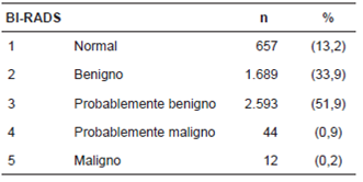 En el examen clínico de la mama, se registró algún hallazgo positivo en 41 (0,8 %) participantes, y en 100 (2,0 %), mediante la palpación. Por otra parte, 2.593 (51,91 %) mamografías se clasificaron como BIRADS 3 (IC95% 50,5-53,3) y 56 (1,12 %) se clasificaron como BIRADS 4 o 5 (IC95% 0,8-1,4) (tabla 4).