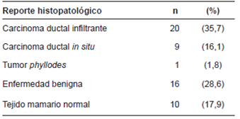 Tabla 5. Resultados de la histopatología de las pacientes con mamografías BIRADS 4 y 5 en el plan de tamización del Huila, agosto de 2012 a diciembre de 2013 (n=56).
