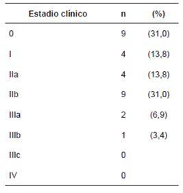 De las 4.995 participantes, se identificaron 29 (0,6 %) mujeres con cáncer de mama (IC95% 0,4-0,8), 9 con reporte de carcinoma ductal in situ y 20 con reporte de carcinoma ductal infiltrante. De estas 29 mujeres con cáncer, 17 (58,6 %) tenían tumores tempranos (IC95% 38,9-76,5) (tabla 5). Entre otros hallazgos de histopatología, hubo un tumor Phyllodes y en 26 estudios no hubo signos de malignidad. Ocho (27,6 %) pacientes se encontraron en estadio temprano y tres pacientes (10.3%) fueron clasificadas como estadio clínico III de la enfermedad (Tabla 6).
