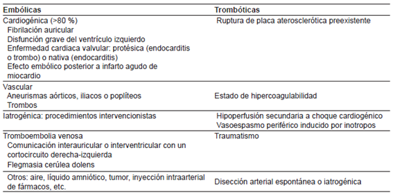 La isquemia arterial aguda de las extremidades puede deberse principalmente a dos tipos de accidentes vasculares, los embólicos y los trombóticos. (tabla 1).