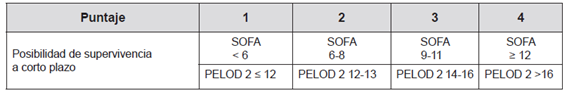 Primer paso. El CCP evaluará a todo paciente que requiera cuidado intensivo y soporte ventilatorio. Para determinar si es elegible para dicho cuidado, el CCP aplicará, en adultos la escala SOFA (Sequential Organ Failure Assessment) 7,8,17,25 y, en niños, niñas y adolescentes, la escala PELOD 2 (Pedyatric Logistic Organ Dysfunction). Esta escala permite establecer, según lo exige el Principio de mayor bien, cuáles pacientes tienen mayor posibilidad de beneficiarse a corto plazo, es decir, de sobrevivir tras el alta hospitalaria (tabla 1)6,7.