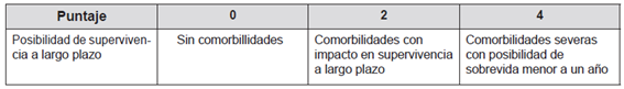Dicha escala asigna puntuaciones para pacientes sin comorbilidades, con comorbilidades con impacto en supervivencia a largo plazo y con comorbilidades severas con posibilidad de sobrevida menor a un año. Comorbilidades con impacto a supervivencia a largo plazo incluyen trastorno neurocognoscitivo mayor moderado, enfermedad con sobrevida esperada menor de 10 años, falla cardiaca NYHAIII, EPOC moderadamente grave, enfermedad renal en etapa terminal en pacientes menores de 75 años, cirrosis con antecedentes de descompensación, entre otros. Por su parte, las comorbilidades severas con posibilidad de sobrevida menor a un año incluyen trastorno neurocognoscitivo mayor severo, cáncer en tratamiento paliativo, falla cardiaca NYHAIV, EPOC grave, cirrosis no elegible para trasplante, enfermedad renal en etapa terminal en pacientes mayores de 75 años, y otros.