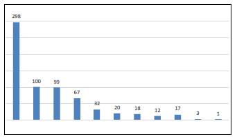 Se practicaron 1019 procedimientos quirúrgicos electivos en 732 pacientes, entre el 7 de abril y el 7 de julio de 2020, con la participación de 21 cirujanos vinculados al Centro de Cirugía Ambulatoria, de las especialidades de Cirugía General, Ginecología y Obstetricia, Cirugía Pediátrica, Cirugía Vascular, Mastología, Urología, Ortopedia y Cirugía Plástica. El 73 % (483) de los pacientes en nuestra serie fueron mujeres y el 27 % (184) hombres. Las edades oscilaron entre 0 y 71 años, con un promedio de edad de 40.6 años (figura 2).