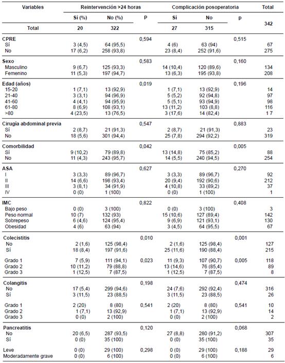 El análisis bivariado también reveló asociación entre la edad, la presencia de alguna comorbilidad, el diagnóstico prequirúrgico de colecistitis aguda y una mayor gravedad de la colecistitis aguda, con una reintervención después de las 24 horas. Las complicaciones posoperatorias fueron más frecuentes en pacientes con comorbilidad, colecistitis aguda y mayor gravedad de la colecistitis aguda.