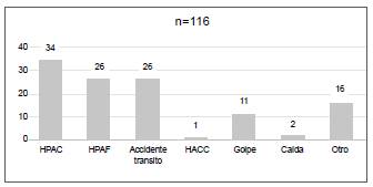 Las heridas por arma corto-punzante fueron el mecanismo de trauma más común, en 34 (29,3%) de los pacientes, seguidas por las heridas por arma de fuego y los accidentes de tránsito, ambos en 26 (22,4 %) pacientes; los traumas menos frecuentes fueron otros tipos de golpes contundentes, incluidos los casos de caídas de altura (figura 1).