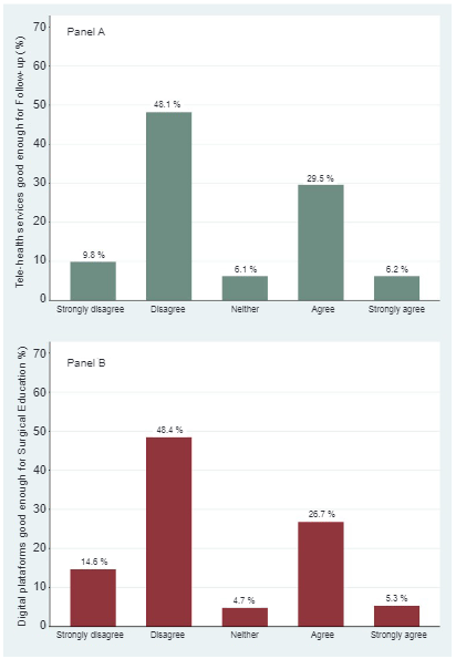 Figure 3. Perceptions about using digital platforms for surgical follow-up (Panel A) and surgical learning (Panel B).