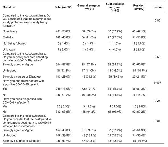 Overall, 72.9% (n=259) participants reported to have had direct contact with COVID-19 positive patients, with a reported infection rate of 6.5% (n=23) among respondents (Figure 2). Although a higher proportion of residents have been in direct contact with COVID-19 positive patients, no differences were observed in reported COVID-19 infections among respondents (Table 2). In general, 57.4% (n=204) participants felt safe during surgical procedures at the moment the survey was answered, in contrast to 29% (n=103) who did not.