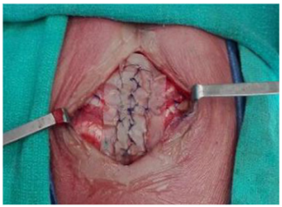 Con estos hallazgos imagenológicos, teniendo en cuenta las malformaciones asociadas, la edad de presentación y el potencial crecimiento estimado del paciente, se define realizar una primera corrección con intención transitoria, hasta tener un crecimiento definitivo de la caja torácica, por lo que se plantea la opción de una reconstrucción con barras absorbibles y pericardio bovino. Bajo anestesia general se procede a incisión en línea media torácica de 10 cm, se diseca por planos y se procede a liberación de la línea media y del pericardio. Posteriormente se liberan los músculos pectorales y se expone la pared costal anterior (figura 2). Se procede al cierre del tejido mediastinal remanente sobre el pericardio, con polipropileno 5-0. Se construye un “neoesternón” en banco, con 2 placas absorbibles sobre una cama de pericardio bovino de 10 cm x 4.5 cm (figura 3), el cual se fija a la pared anterior del tórax en 4 puntos, con sutura de polipropileno (figura 4). Finalmente se inserta dren de Jackson Pratt sobre el “neoesternón” y se cierran los colgajos musculares de los pectorales, tejido celular subcutáneo y piel, completando la cirugía sin incidentes (figura 5).