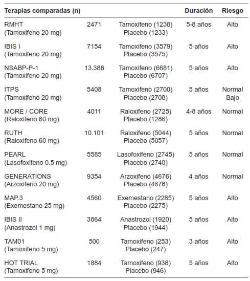 Cuatro experimentos clínicos aleatorizados compararon tamoxifeno a dosis de 20 mg al día versus placebo para la reducción del riesgo de desarrollar cáncer de seno 42-45. Dos experimentos clínicos aleatorizados compararon raloxifeno a dosis de 60 mg al día versus placebo con el mismo fin 46,47 y otros dos experimentos clínicos aleatorizados compararon lasofoxifeno, arzoxifeno versus placebo 48,49.