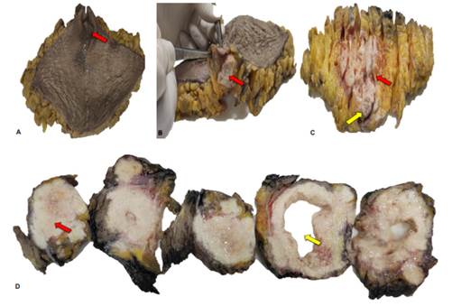 Figura 3. A. Elipse de piel de la pieza quirúrgica. La flecha roja señala el ombligo. B. Se expone el ombligo a nivel subcutáneo, el cual presenta una lesión neoplásica de color pardo claro. C. Elipse de piel con múltiples cortes seriados, la flecha amarilla muestra el ombligo, y de él se propaga la lesión tumoral, la cual compromete gran parte del tejido adiposo (flecha roja). D. Cortes seriados de la masa tumoral, la cual era de color pardo claro, con áreas sólidas (flecha roja) y áreas de degeneración quística (flecha amarilla).
