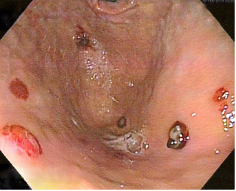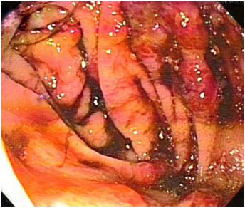 Figura 3. Lesiones por angiosarcoma en colon con sangrado reciente que obstruye la correcta visualización.