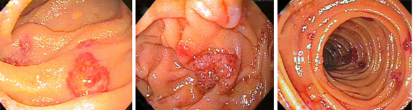 Por persistencia del sangrado digestivo y anemización, una semana después llevan a enteroscopia con doble balón anterógrada, en la cual reportan “infiltrados algodonosos en esófago, múltiples lesiones vasculares con coágulos adheridos en estómago, duodeno y yeyuno”. El estudio histopatológico indica “ileítis aguda severa ulcerada, con células altamente sugestivos de infección viral por herpes versus citomegalovirus (CMV)”. Una segunda revisión de patología refiere un “resultado indeterminado, con células atípicas que podrían corresponder a neoplasia”, no descartaron sarcoma de Kaposi. Solicitaron estudios para virus de inmunodeficiencia humana (VIH), CMV, herpes virus, virus de hepatitis, siendo todos negativos.