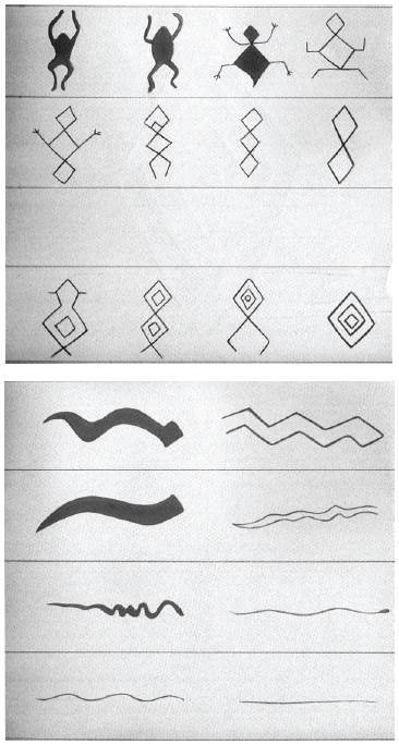 En cuanto a las formas esquemáticas figurativas, ellas hacen referencia directa a las plantas, las flores y los animales autóctonos, como los camélidos (llamas, alpacas, vicuñas, ovejas, etc.), serpientes, aves, murciélagos, lagartos, ranas, escorpiones, arañas, búhos, leopardos, pumas, águilas, algunos insectos y otros felinos de las zonas.