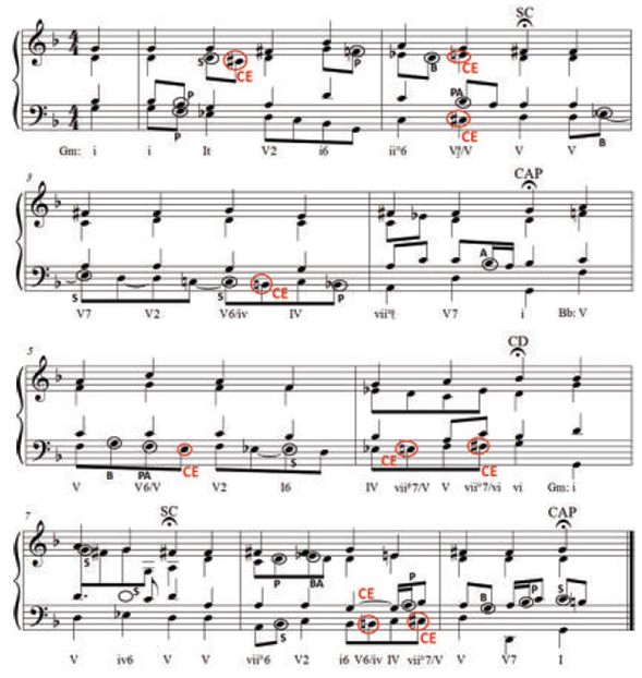 En este sentido, el re# del tenor debe ser interpretado como un CE que está soportado en las voces superiores. Por lo tanto, este caso excepcional se cifraría como una dominante secundaria (vii°/V) dentro de la mayor, pero que está sobre una nota pedal de V.