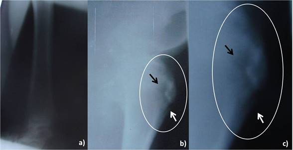 Entre los datos anamnesicos, se tiene que la novilla fue encontrada en el potrero en decúbito, al siguiente día de haber sido sometida a un proceso de aspiración folicular con procedimiento anestésico de epidural baja. Se incitó a pararse mostrando manifestaciones de dolor y apoyo plantar con el metatarso del miembro posterior izquierdo, el servicio clínico fue solicitado 8 días posterior la alteración, por lo que fue solicitado la realización de pruebas radiológicas del área afectada.
