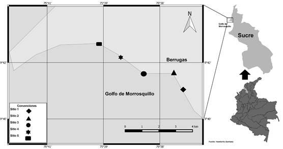 Figura 1 Área de estudio y los puntos de muestreo en la costa norte del Golfo de Morrosquillo, Sucre, Colombia.