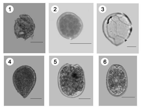 Figura 2 Especies de dinoflagelados epífitos de la costa norte del Golfo de Morrosquillo: (1) Cabra cf. aremorica, (2) Coolia sp., (3) Ostreopsis lenticularis, (4) Ostreopsis ovata, (5) Prorocentrum emarginatum, (6) Prorocentrum lima. Escala 20 µm.