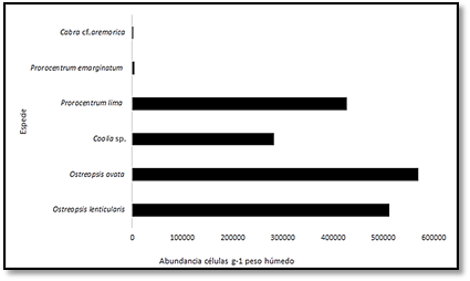 Según lo anterior, Ostreopsis fue el género más frecuente y abundante durante el estudio. Aportando la mayor abundancia con más del 50% total de células (1080621 células/g PHS) (Figura 3), una tendencia poco común dentro de los estudios en el Caribe, donde P. lima (BOMBER et al., 1988a; BOMBER et al., 1989; DELGADO et al., 2006; MARTÍNEZ-CRUZ et al., 2015) y P. mexicanum (AGUILAR-TRUJILLO et al., 2014; OKOLODKOV et al., 2014) normalmente aportan las abundancias más altas. Por lo tanto, los ensamblajes de dinoflagelados de la costa norte del golfo de Morrosquillo, son extrañamente más a fines con los encontrados en aguas del Mar Mediterráneo o costas con clima templado (RHODES et al., 2000; VILA et al., 2001; SHEARS y ROSS, 2009; COHU y LEMÉE, 2012) que con ambientes tropicales.