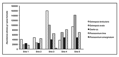 El sitio con mayor riqueza fue el sitio tres con seis taxones, mientras que en los otros sitios solo se observaron cuatro (Tabla 2). Todos los sitios fueron dominados principalmente por Prorocentrum y Ostreopsis; los cuales, comprenden más del 80% de la abundancia total de las células en el área de estudio (Figura 3). La máxima abundancia que presentó cada una de las especies fueron las siguientes: O. lenticularis con 67.760 células/g peso húmedo de sustrato (PHS), sobre la macroalga Coelothrix irregularis; mientras O. ovata, P. lima y Coolia sp. tuvieron concentraciones de 48.800, 40.500 y 24.800 células/g PHS sobre T. testudinum, respectivamente. Con una menor cantidad se establecieron P. emarginatum con 2.100 células/g PHS asociado a Syringodium filiforme y Cabra cf. aremorica 1313 células/g PHS sobre Gracilaria sp.