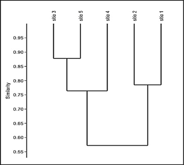 Similitud entre sitios de muestreo: A través del análisis de similitud (Figura 5) se pudo observar la formación de dos grandes grupos. El primero, conformado por los sitios tres, cuatro y cinco, los cuales soportaron las mayores abundancias y riqueza de especies, con una semejanza de más del 75%. La segunda agrupación formada por los sitios uno y dos, los cuales tuvieron los valores más bajos de abundancia y riqueza.