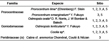 Tabla 2 Especies de dinoflagelados epífitos de la costa norte del Golfo de Morrosquillo y los sitios donde fueron observados. (*) Especies productoras de toxinas. (is) incertae sedis.