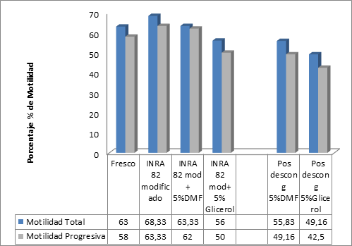 En la evaluación de los parámetros de motilidad o viabilidad espermática pos descongelación el uso del glicerol como crioprotector es controversial. Investigaciones anteriores reportan qué su uso puede ser un factor involucrado en bajas tasas de movilidad y vigor espermático (ALVARENGA et ál., 2005). Los resultados obtenidos muestran que la motilidad espermática con dimetilformamida se mantuvo ligeramente más alta durante la evaluación en relación al glicerol, pero para ambos tratamientos la motilidad decayó en el mismo intervalo de tiempo pos descongelación, sin observarse diferencias significativas, lo cual coincide con estudios semejantes donde no encuentran diferencia asociadas al daño del glicerol sobre la membrana espermática cuando se asocia a un medio extensor enriquecido (MORILLO, 2013).