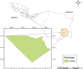 Área de estudio. El ejido de Pitzotlan, se localiza en el municipio de Tepalcingo en el estado de Morelos, México. Geográficamente, en las coordenadas 18'34'58'' de LN y 98'53'29'' de LO (Figura 1), a una altitud de 1.178 metros sobre el nivel del mar y cuenta con una superficie de 1.009 hectáreas. La comunidad presenta una población mestiza de 39 habitantes de los cuales 26 son hombres y 13 mujeres (INEGI, 2010), clasificados en la categoria de muy alta marginación (MUNDO, 2011).