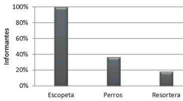 La escopeta fue el principal instrumento de apropiación de la mastofauna local, arma que caracteriza a la cacería de subsistencia, lo cual ha sido reportado en otras regiones de México, Argentina, Colombia y Perú (PAUTASSO, 2003; GONZÁLEZ y LLERENA, 2014; RACERO y GONZÁLEZ, 2014; AMADOR y DE LA RIVA, 2016). Además, se utilizan otros instrumentos como perros y resorteras en combinación con las armas de fuego, por ejemplo, la escopeta junto con perros para la captura de presas grandes y escopeta con resortera para presas chicas, situación que describe AMADOR y DE LA RIVA (2016) en comunidades de Aguascalientes, México. Igualmente, la utilización de perros en conjunto con armas de fuego se ha y Argentina, principalmente porque eleva la eficacia para la apropiación de fauna, al convertir a los perros en rastreadores de las presas y capturándolas con las armas de fuego (PAUTASSO, 2003; HERNÁNDEZ et al., 2013; GARCÍA et al., 2014; LIRA et al., 2014).