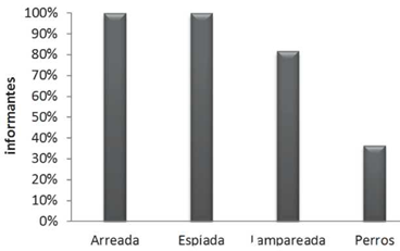 Se registraron tres tipos de armas utilizadas en la cacería, siendo el arma de fuego (escopeta) la más utilizada para la captura de presas (Figura 2). De acuerdo con los informantes en la comunidad se practican cuatro técnicas para llevar a cabo el aprovechamiento de los mamíferos silvestres, las más utilizadas es la espiada y arreada, las cuales fueron referidas por el 100% de los cazadores (Figura 3).