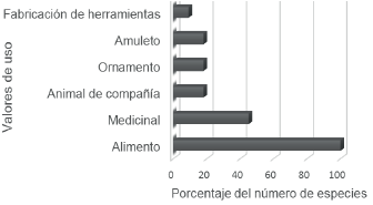 Se registraron seis valores de uso para los mamíferos silvestres: alimento, medicina, animal de compañía, ornamental, amuleto y fabricación de herramientas, destacando el alimentario y medicinal con el mayor número de especies, con 11 y 5 respectivamente (Figura 4).
