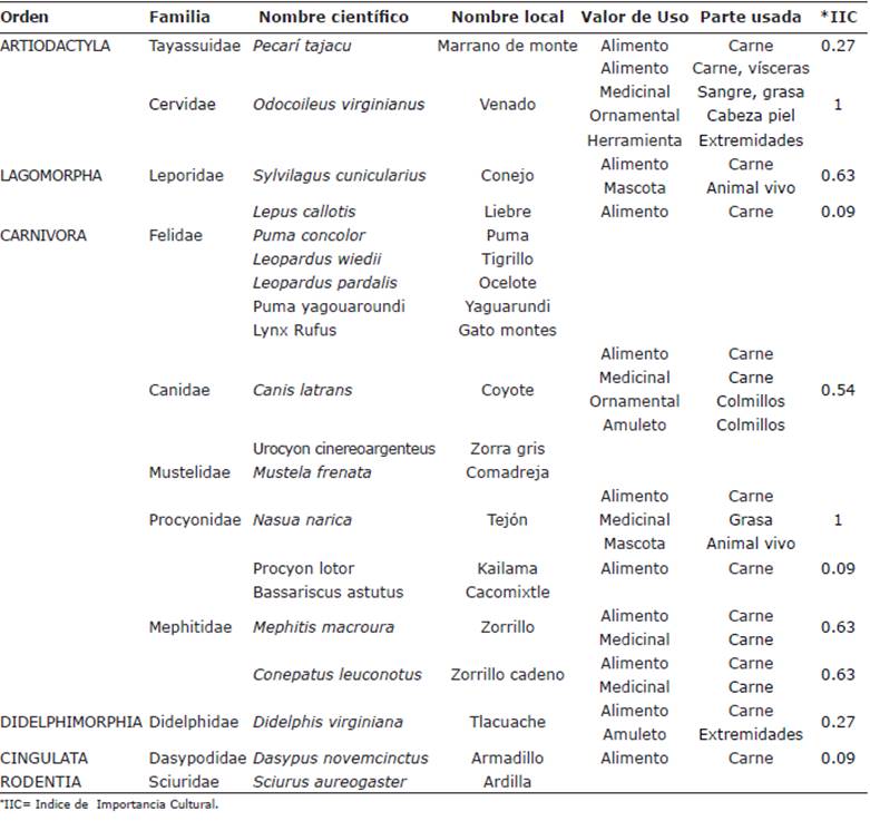 Del total de especies reconocidas para el ejido por los entrevistados (n= 20 especies), el 55% (n=11) tienen valor de uso (Tabla 1), siendo más representativo el orden Carnívora y las familias Procyonidae, Mephitidae, Leporidae por el número de especies registradas con valor de uso (VU). Las especies con mayor valor de uso fueron el venado cola blanca Odocoileus virginianus (IIC= 1) y tejón Nasua narica (IIC= 1).