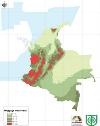 M. mipartitus: El área potencial que esta especie ocupa es de 106.76 km2 aproximadamente, la cual se distribuye desde 10°22'39", 74°15'41",(Magdalena), hasta 2°47'50", 76°38'26", (Cauca) (Figura 5), según los resultados de la distribución potencial, M. mipartitus, se encuentra con alta probabilidad de ocurrencia en bosques bajos montañosos, bosques de niebla y matorrales secos y rocosos, encontrándose en los departamentos de Cauca, Valle del Cauca, Meta, Chocó, Cundinamarca, Boyacá, Caldas, Magdalena, Antioquia, Huila, Bolívar, Santander y Risaralda, por debajo de los 2.410 msnm.