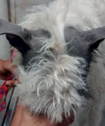 Al examen clínico general presenta frecuencia cardiaca de 88 lpm, frecuencia respiratoria de 24 rpm, temperatura de 38.7°C, buena condición corporal (4/5), tiempo de llenado capilar 2 segundos, pulso rítmico y fuerte, sonidos normales a la auscultación pulmonar y cardiaca, reflejo tusígeno negativo, mucosas rosadas, actitud alerta, demostrando que al examen físico no evidenció ninguna alteración sistémica, encontrándose como hallazgo relevante la presencia de alopecia circunscrita e hipotricosis en las áreas negras ubicadas en la zona temporal de la cabeza y las orejas, apruriginosa, con leve seborrea (Figura 1), sin presencia de otras lesiones dermatológicas y sin antecedentes de otras enfermedades.