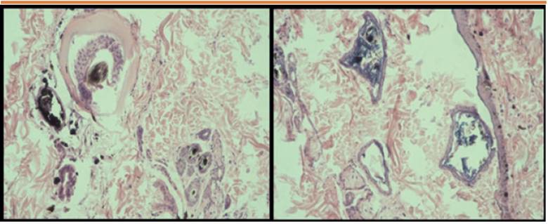 Se procede a realizar raspado de piel, siendo éste negativo para ácaros de la sarna, y a enviar posteriormente muestra para histopatología de las áreas negras sin pelo afectadas, con el siguiente reporte: Se observa una epidermis con un epitelio estratificado plano con hiperqueratosis leve y focos múltiples con pigmentación de melanina en la capa basal y la lámina propia. A nivel subepitelial se encuentra atrofia de las glándulas sebáceas, algunos folículos pilosos dilatados y con presencia de queratina en su interior. En zonas cercanas, los folículos pilosos presentan poco desarrollo y con presencia de melanina en su interior así como en la periferia en cantidad variable y en el bulbo del folículo (Incontinencia pigmentaria perifolicular) (Figura 2). Focos pequeños de melanina también está presente en el tejido adiposo adyacente. No se observa reacción de polimorfo-nucleares ni de células linfoplasmacitarias a nivel peri-vascular. El edema observado es escaso. Diagnóstico histopatológico: Hallazgos compatibles con una displasia folicular del pelo negro.