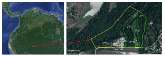 Área de estudio: El trabajo fue realizado en tres áreas de fragmentos forestales de bosque secundario denominados para este estudio como: (i) fragmento forestal de borda (FFB), cercano a la carretera; (ii) fragmento forestal conservado (FFC), con mayor diversidad de especies arbóreas; (iii) fragmento forestal de transición (FFT), localizado en un área abierta cercana de una quebrada y (iv) un área alterada de pastizal (AP). Todos los paisajes estudiados se encontraron localizados en el Centro para la Biodiversidad y el Turismo del Amazonas del Servicio Nacional de Aprendizaje - SENA Regional Amazonas, en el Municipio de Leticia, Amazonas, Colombia (Figura 1).